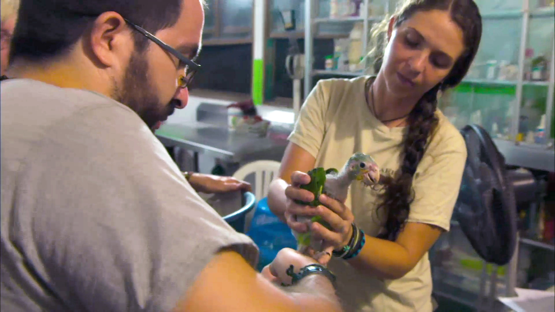 Dr. Alejandro Morales and zoologist Anna Bryant examine a rescued baby parrot in JUNGLE ANIMAL HOSPITAL. Photo ©BBC.