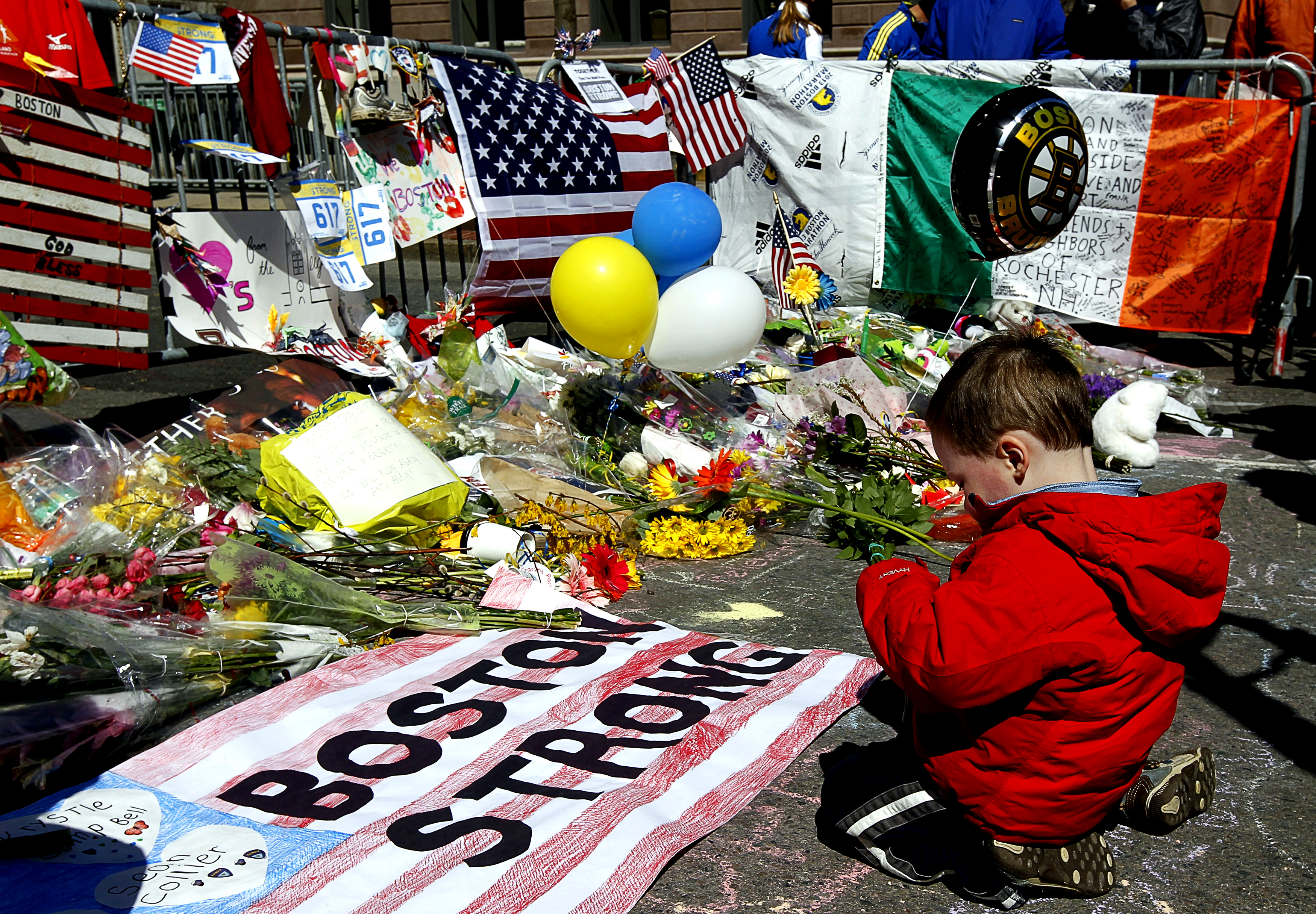 Two-year-old Wesley Brillant of Natick, Mass., kneels in front of a memorial to the victims of the Boston Marathon bombings in April 2013. Photo: REUTERS/Jim Bourg. Courtesy HBO.