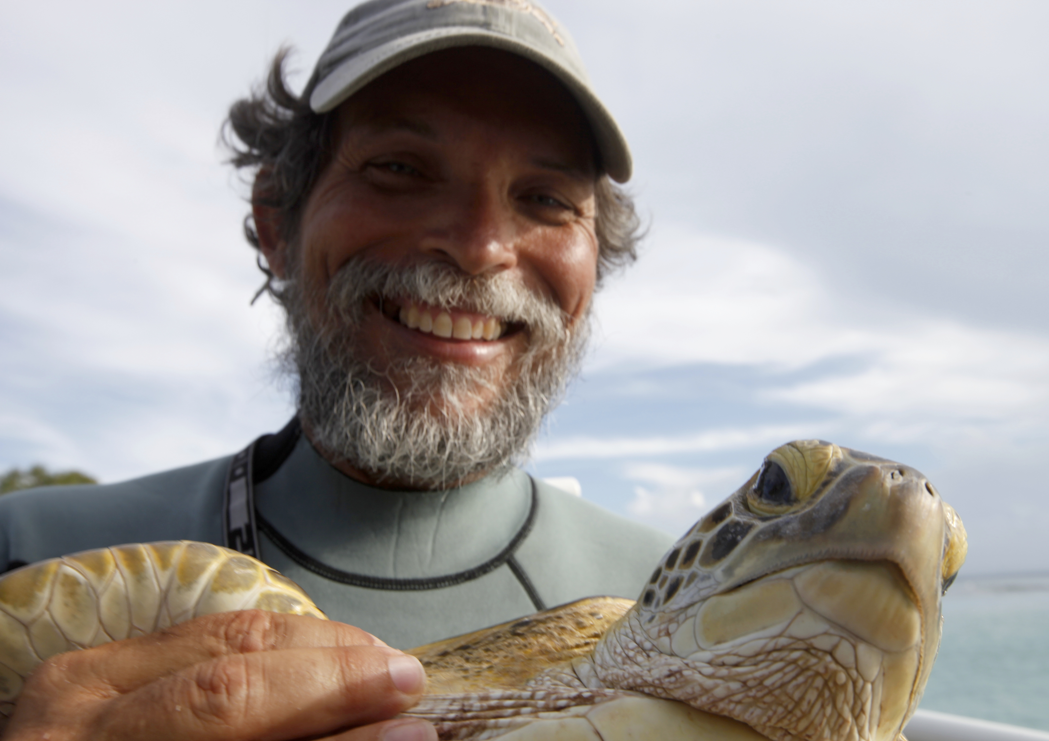 Carlos Diez catches a critically endangered Hawksbill turtle to gather data for its conservation in NATURE: VIVA PUERTO RICO. Photo courtesy George Woodcock/©BBC/ Windfall Films.