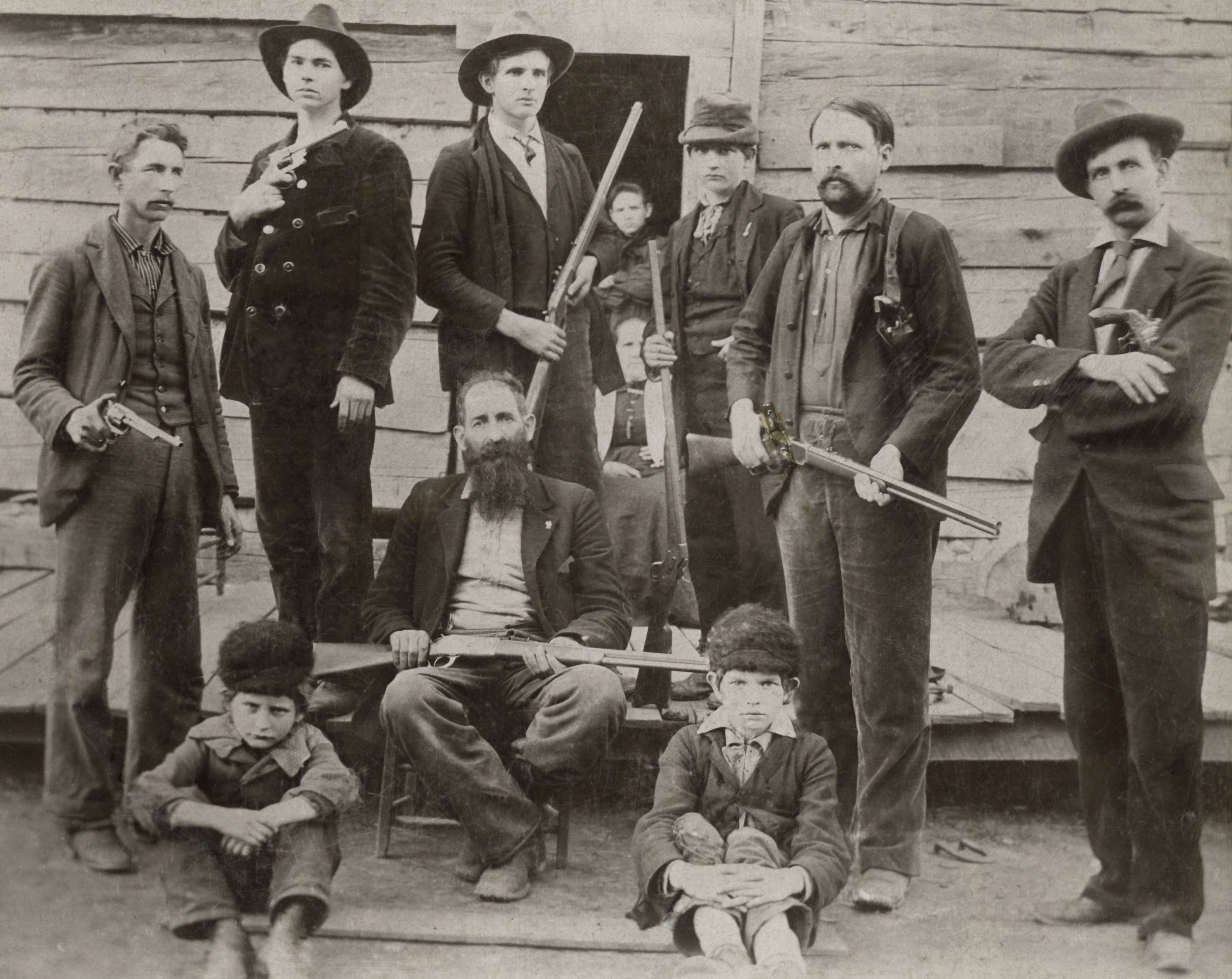 Hatfield Family Portrait, circa 1897. Bearded patriarch William Anderson “Devil Anse” Hatfield, seated next to his wife, Levisa “Levicy” Hatfield, surrounded by their family and assorted weaponry. Photo courtesy of Library of Congress.