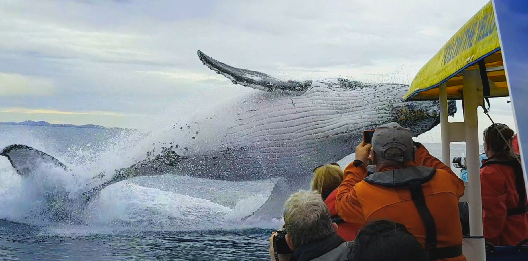 PBS NATURE wildlife filmmaker Tom Mustill became obsessed with whales after a humpback whale almost breached on top of his kayak in Monterey Bay, California. Photo© Viralhog.