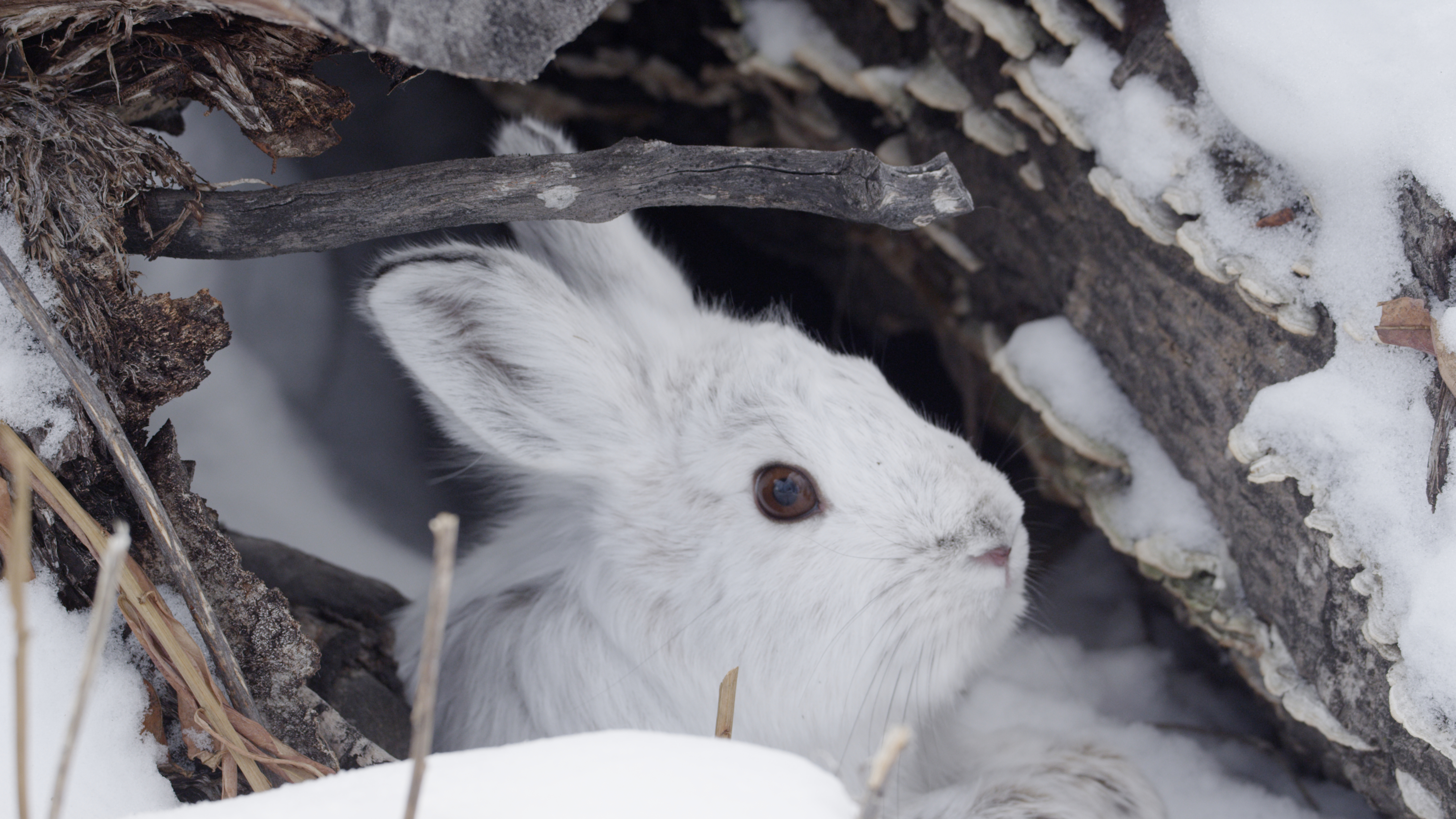 Can this little fuzzball be any cuter or stressed? Snowshoe Hares are resilient denizens of snow covered North American landscapes but face determined predators. NATURE: REMARKABLE RABBITS documents an especially challenging chase in Yukon, Canada, triggered by the hare’s prime nemesis, a hungry Canada lynx. Photo © Remarkable Rabbits Inc.