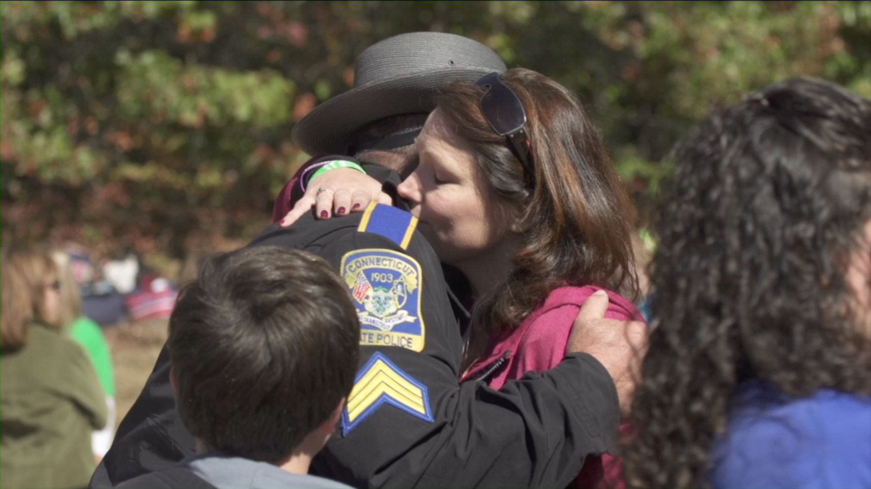 Nicole Hockley, mother of Sandy Hook victim Dylan Hockley, with first responder Sgt. William Cario. Photo courtesy of Derek Weisehahn.