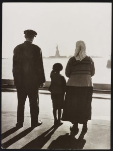 An immigrant family gazing at the Statue of Liberty in New York Harbor from Ellis Island, circa 1930. Photo courtesy Library of Congress.