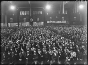 A Nazi party political rally. The sign in back reads: “Kauft nicht bei Juden”–“Don’t buy from Jews.” Photo courtesy National Archives and Records Administration.