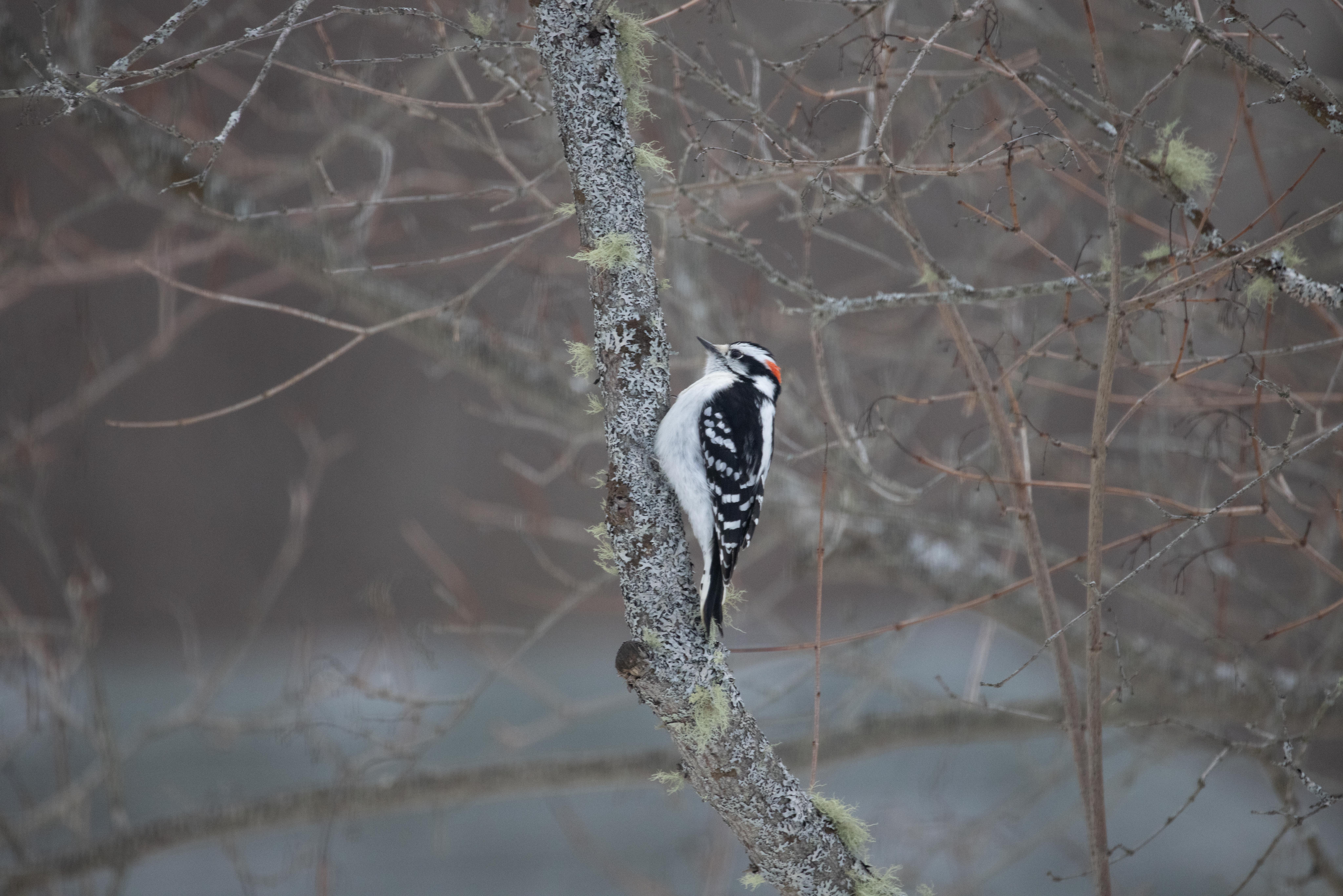 A Downy Woodpecker has no trouble with the cold winter temps in Brooklin, Maine. Photo courtesy © Russell Kaye.